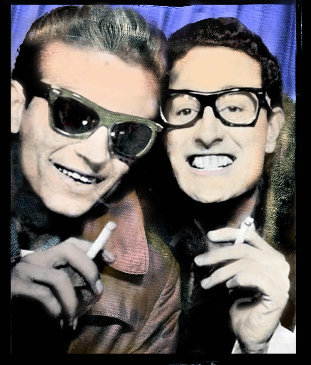 This fantastic photo has been colorized and printed as a full-sized giclee, about 16" x 19". There are two of these -- this one, grinning with cigarettes and another, with the deadpanning Holly flipping the middle finger in front of Waylon's face.